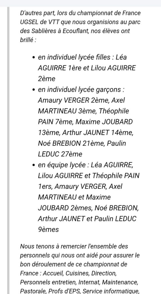 Du lundi 5 mai au mercredi 7 mai, notre lycée a eu l’honneur d’organiser le championnat de France UGSEL VTT, réunissant 180 athlètes de 40 établissements de France.