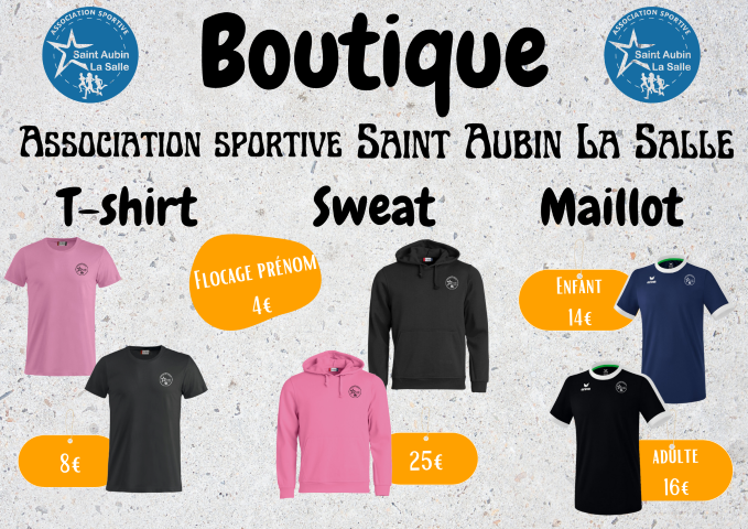 La boutique de l’association sportive vous propose des sweats et t-shirts estampillés « Saint Aubin La Salle » pour représenter l’établissement lors de vos compétitions sportives et financer les transports et les activités de l’association. Découvrez sans tarder nos produits ici :