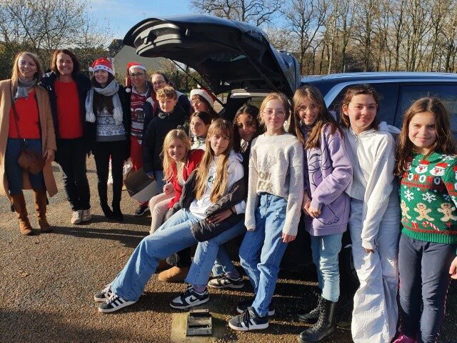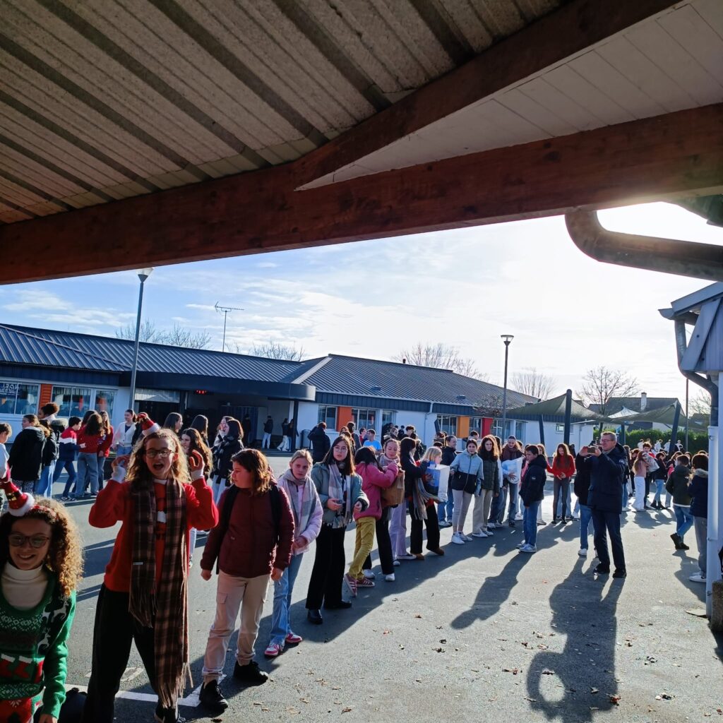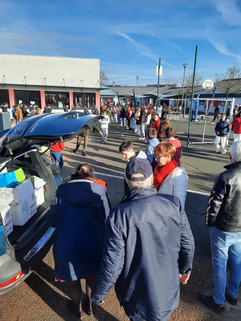 Voici quelques photos des élèves qui ont fait une chaîne au milieu de la cour afin d’apporter l’ensemble des dons à l’Association.