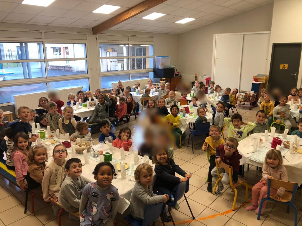Les PS ont fabriqué du jus d’oranges et de pommes, les MS et GS de la classe de Sandrine du beurre et ceux de la classe de Cécilia ont fabriqué le pain pour que l’on partage un petit déjeuner tous ensemble à l’école.