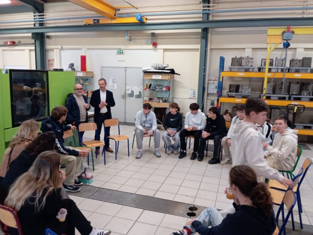 A la suite de son intervention générale à l’amphithéâtre, M. Lipinski est venu visiter l’atelier de plasturgie et chaque élève du groupe a pris la parole pour présenter un aspect de la filière ou expliquer le mode de fonctionnement des machines. M. Lipinski s’est montré particulièrement intéressé par la filière de la plasturgie puisqu’il participe à la conception de ses propres bateaux.