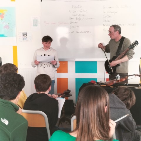 La « Résistance », pour Yves-Henry Guillonnet, est au coeur même de sa pratique. Peinture, poésie, ce touche-à-tout explore différentes facettes de l’expression artistique. Nous le remercions d’avoir apporté cette magie musicale, le temps d’une rencontre avec nos futurs lycéens.