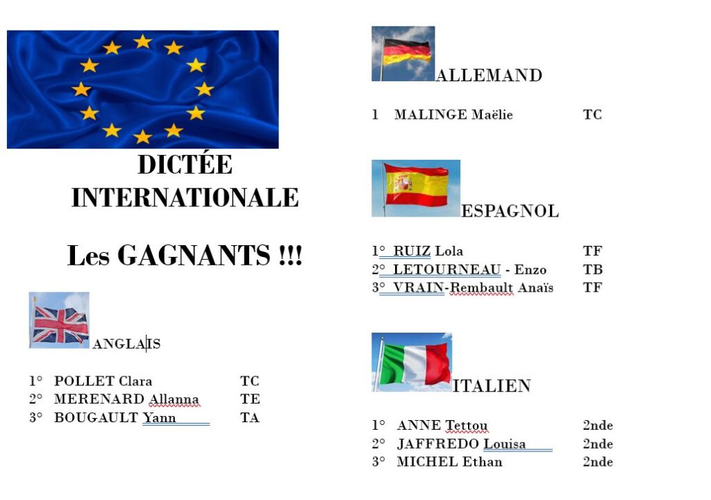 L’objectif était clair : encourager la découverte et la pratique des langues de nos voisins européens de manière ludique et accessible à tous. Ainsi, élèves et adultes de l’établissement ont eu l’opportunité de choisir une ou plusieurs dictées parmi les 4 proposées en espagnol, anglais, allemand et italien.