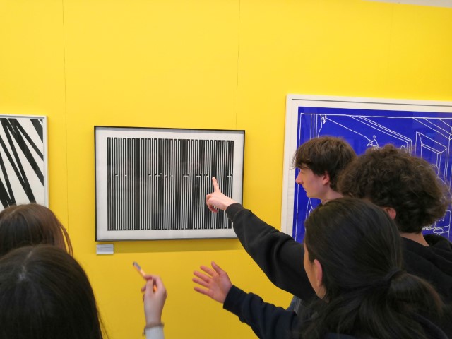 Un médiateur a pu leur présenter dans l’espace de prêt de l’Artothèque une exposition ayant pour thématique Les 40 ans de l’Artothèque d’Angers – Traversée#2. Celle-ci montrait quelques œuvres de sa collection de prêt, en particulier les orientations graphiques de la collection, à travers l’abstraction géométrique, des années 70 à aujourd’hui, le dessin contemporain et l’estampe dans toute son expérimentation.