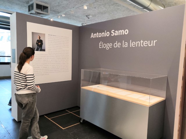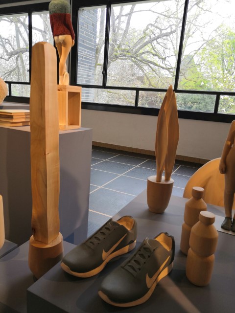 Ensuite, dans l’espace d’exposition, les élèves plasticiens se sont immergés dans l’univers de l’artiste espagnol Antonio Samo. Sa démarche de sculpture s’inscrit dans des recherches autour de la posture humaine, souvent partiellement habillée, ou des natures mortes, brutes ou colorées. Le travail du bois en taille directe, dans du tilleul qui reste léger et reproduit la couleur de la peau, est à la fois rude et délicat. À travers la contemplation de ses œuvres, Antonio Samo invite à réfléchir sur l’identité, la culture du jeunisme, le consumérisme, la communication à l’ère numérique ou la compétitivité dans notre société contemporaine.