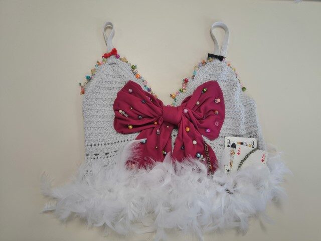Le sacrifice et le détournement d’un vêtement personnel a pu servir de forme de départ pour couper, coudre, former, déformer et reformer les silhouettes, avec pour objectif de commencer la construction, par le vêtement et les moyens à disposition, d’un message.